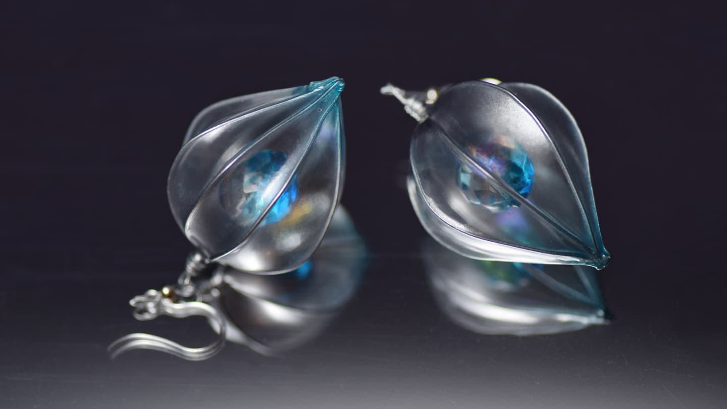 表面張力による流体の瞬間をそのままキープした状態で硬化させて製作します。これは光硬化レジン等ではありません。製作中の初期段階では非常に脆く儚い状態が続きますので、高度な技術と、沢山の造詣経験による精密性を要します。