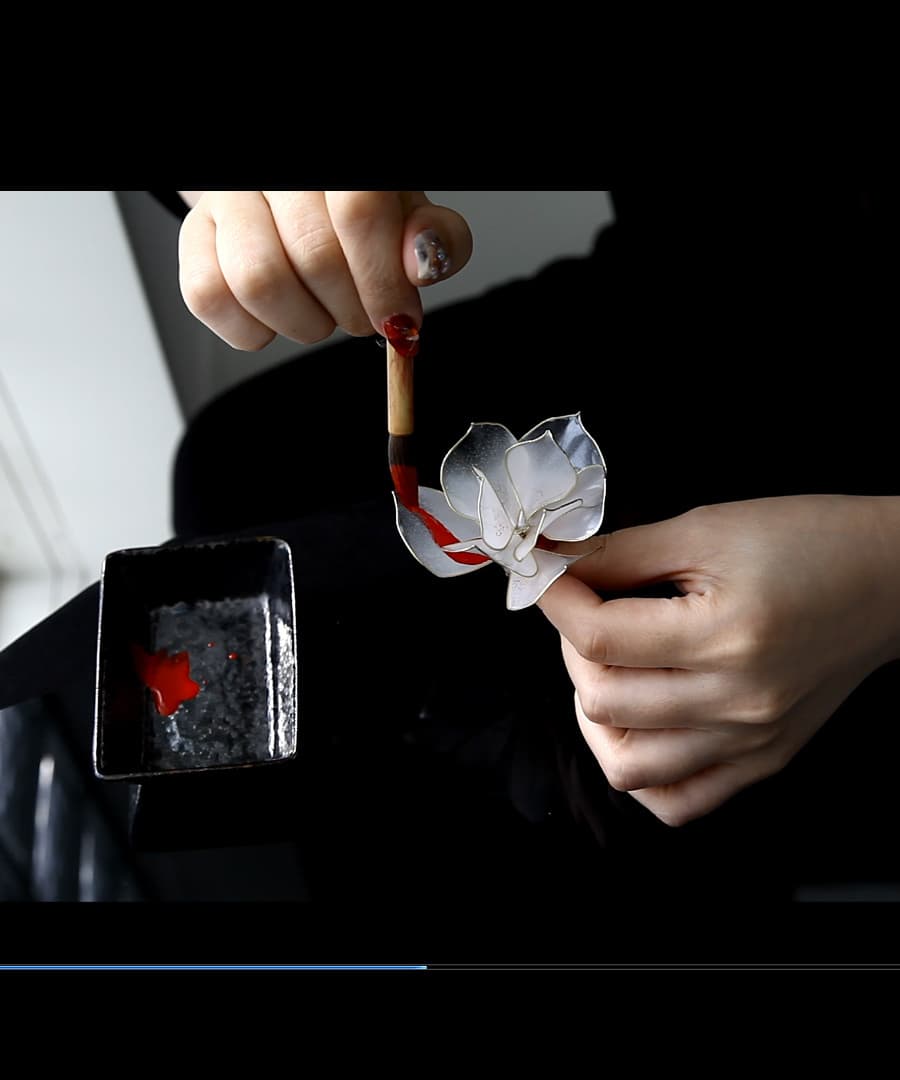 強化剤を何度も使い→乾燥という工程を1週間~10日ほどの間に何度も繰り返し、その途中に美しい色味を段々に積み重ねていきます。刹那一瞬の高度な技術を何度も重ねて、最上級の色の美しいうつろいをみせるかんざしに仕上がったところで、お客様のお手元へお届けしています。